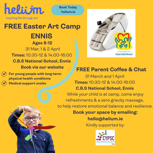 Running alongside our existing children’s programme in Ennis during the Easter midterm, new workshops will support parents to meet others dealing with challenges of caring for children with health conditions. Led by professional artists, workshops will allow parents to experience the joy of Helium Arts and the proven wellbeing benefits to support families.